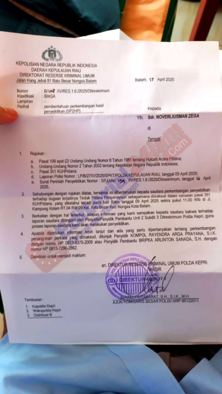 Korban NZ mendapatkan surat Undangan wawancara klarifikasi perkara di Ruang Riksa Subdit 3 Ditreskrimun Polda Kepri, pada Rabu (23/4/2025) kemudian NZ mendapatkan surat SP2HP pada hari yang sama.